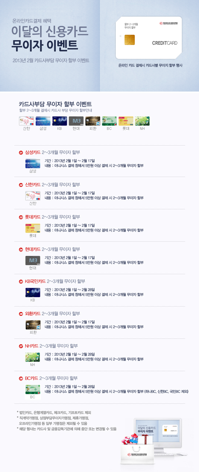 하이미디어 [이벤트] 2013년 2월 온라인결제 신용카드 무이자행사 Post. 2013.02.02 2013년 2월 온라인결제 신용카드 무이자행사 2013년2월1일~ 2013년2월28일