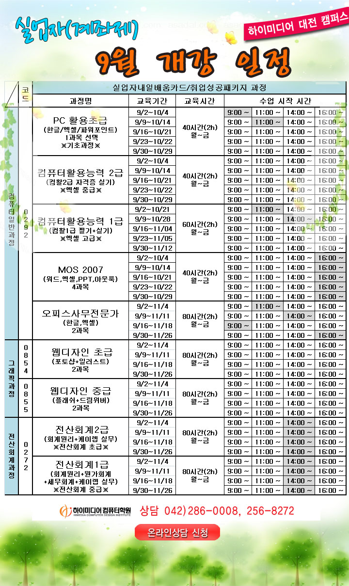 [정규개강]9월 실업자/재직자/일반 과정 일정 안내입니다.