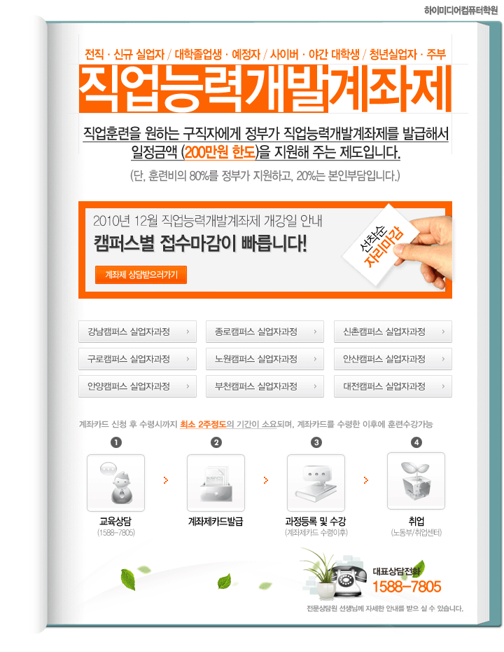 2010년 12월 캠퍼스별 국비지원 계좌제 과정 개강일을 확인 할 수 있습니다.