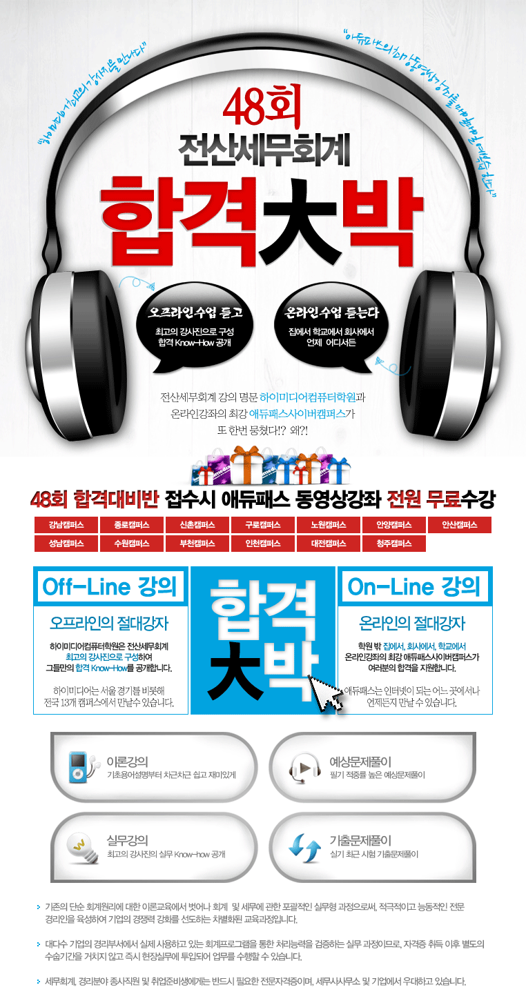 하이미디어 [종료] 제48회 전산세무회계 시험대비반 오픈 Post. 2011.08.26 전산세무회계 강의 명문 하이미디어컴퓨터학원과 온라인강좌의 최강 애듀패스사이버캠퍼스가 또 한번 뭉쳤다!? 왜?!