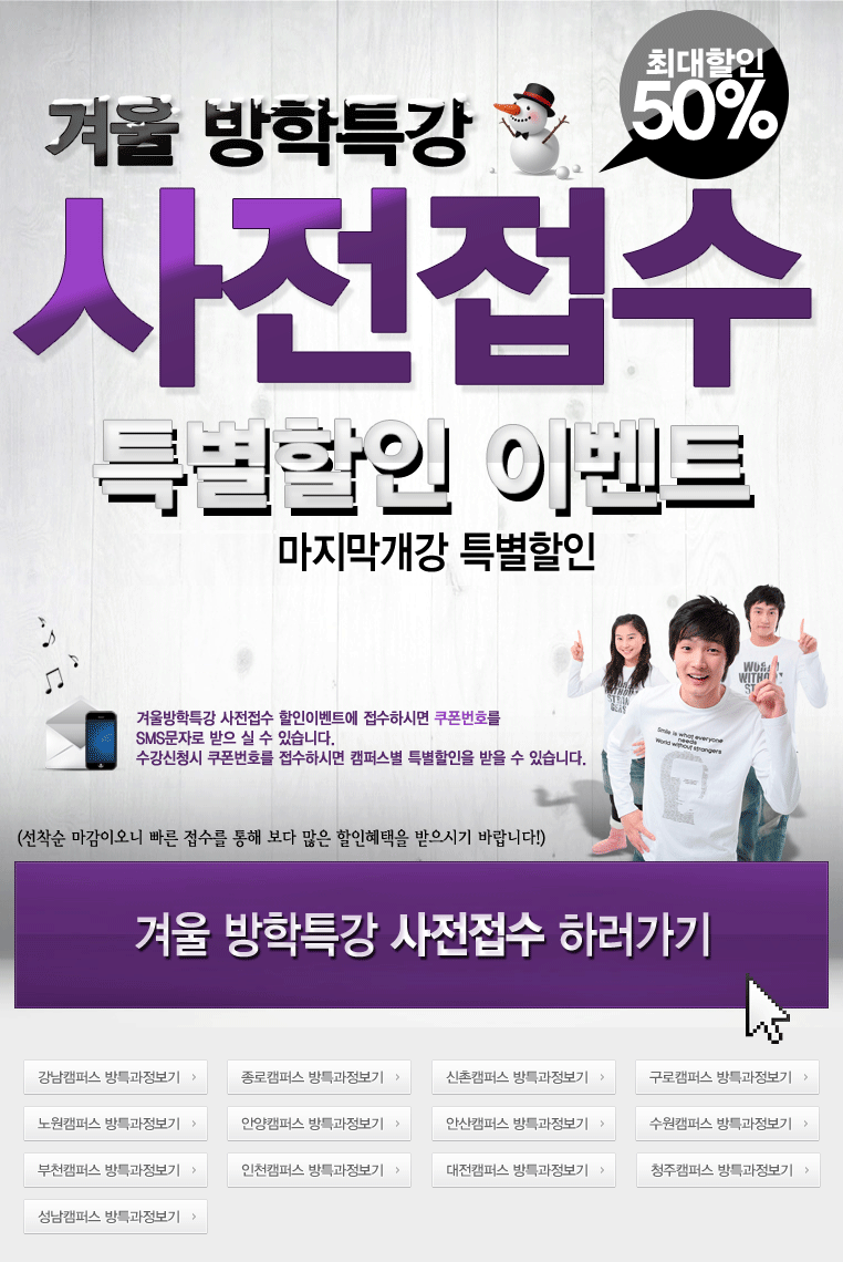 하이미디어 [종료] 겨울방학특강 사전접수이벤트 Post. 2011.11.28 겨울방학특강 사전접수이벤트 이벤트 기간내에 사전접수 하시면 7만원 할인쿠폰를 SMS문자로 받으 실 수 있습니다.