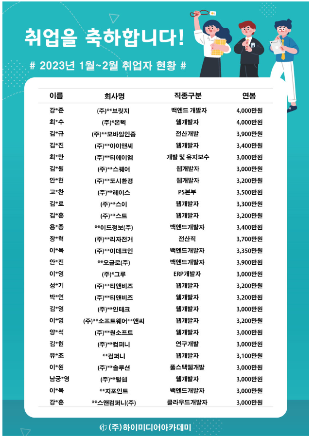 오랜기간 취업에 관한 고민과 노력으로 다듬어진 하이미디어만의 취업시스템은 높은 취업률로 이미 그 결실을 대변하고 있습니다. 1:1 맞춤형 멘토링을 통하여 취업전략상담, 개인직무분석, 맞춤분야추천 등 다방면의 프로그램을 준비해놓고 있으며 취업을 희망하는 하이미디어의 수강생이라면 그 특권을 기꺼이 누리실 수 있습니다.
